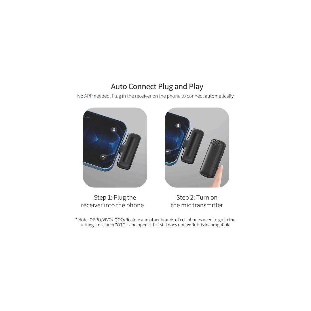 ⚡ No App or Bluetooth Required – Simply plug the receiver into your phone, and the microphone will connect automatically—no extra setup or apps needed.